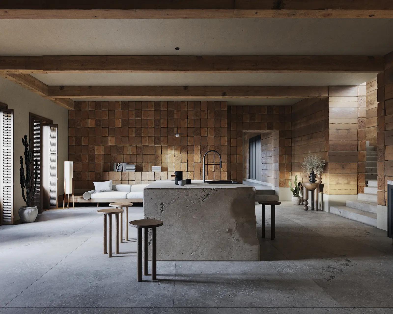 Central to the project's aesthetic is the use of wood, which fills the space with a natural warmth and timeless elegance. This combination of minimalist architecture, sustainability, and the warmth of the materials aims to create a serene and enduring living space that resonates with both beauty and purpose. Ready to welcome both modern design pieces, as well as hand-made artisanal objects.